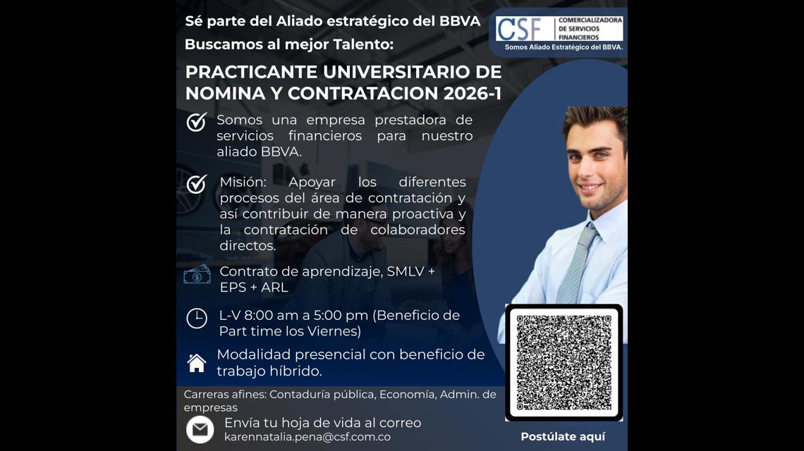 Se busca estudiante de prácticas para el área de nómina y contratación en Comercializadora de Servicios Financieros S.A.S.